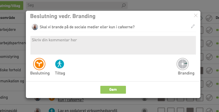 Følgende trin forklarer, hvordan man opretter, deler og kommenterer beslutninger og tiltag til din kundes 30-60-90 dages plan.
