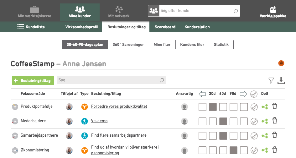 1. Vælg en kundevirksomhed. Gå til 'Beslutninger og tiltag'. Derefter åbnes fanen '30-60-90 dages plan' automatisk.