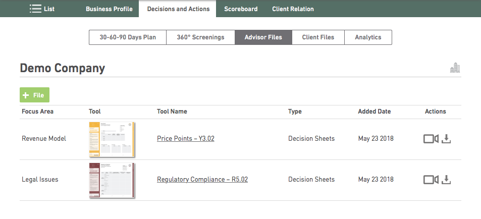 2. Add a decision or an action to the Screening. Click the menu 'Decisions and Actions' and choose the tab 'Advisor Files'.